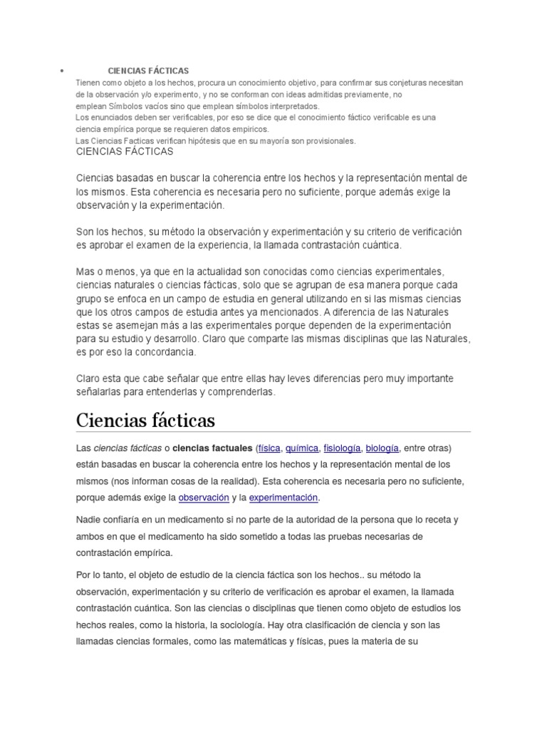 Las ciencias facticas se dividen en. Las Ciencias Fácticas se dividen en Ciencias Naturales y Ciencias Sociales. Las ciencias formales estudian aquellas formas en las que se pueden combinar el conocimiento ya establecido. Las ciencias naturales como la biología física o química que se limitan al estudio de la naturaleza su aplicación a favor del hombre es la ingeniería pero está limitada por la tecnología y las ciencias sociales como la sociología economía política que estudian.