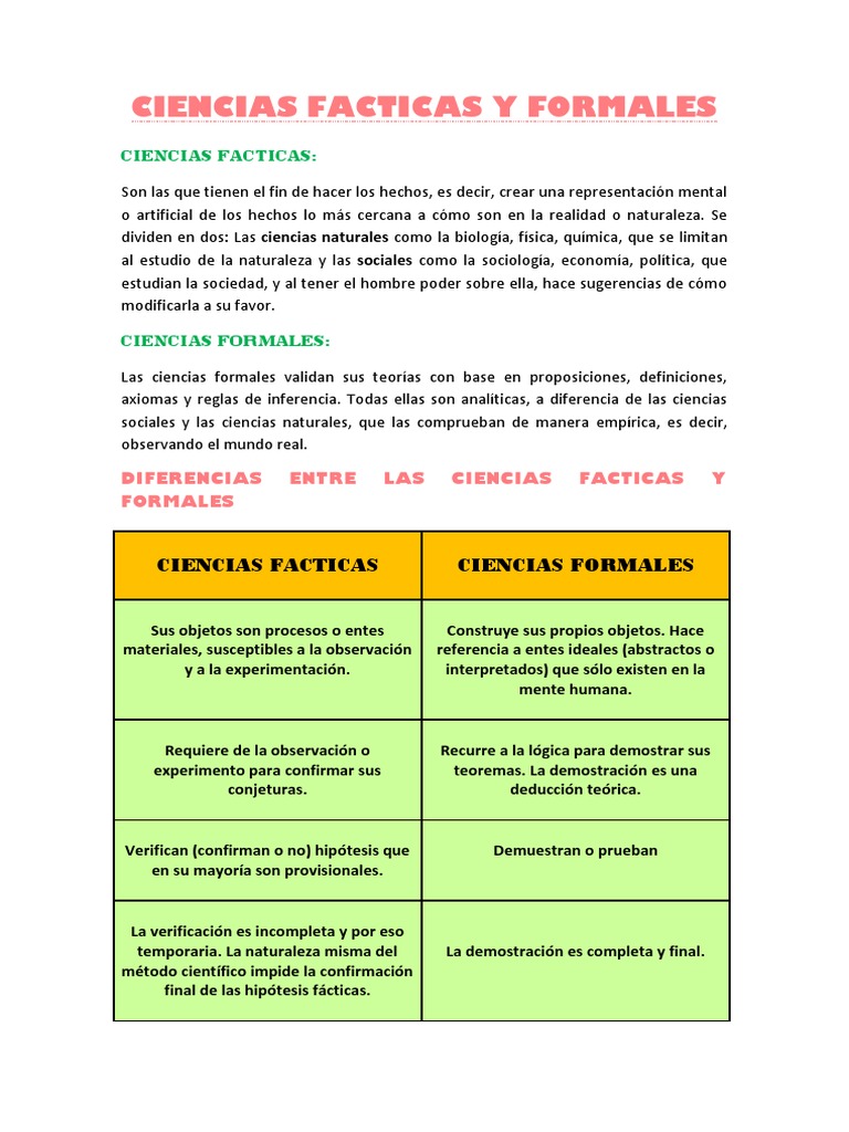 Las primeras son todas aquellas disciplinas de tipo abstracto y que no se ocupan de los hechos tales como la matemática y la lógica. Sociales y naturales o experimentales. Las ciencias fácticasson aquellas que se refieren a algún segmento de la realidad.