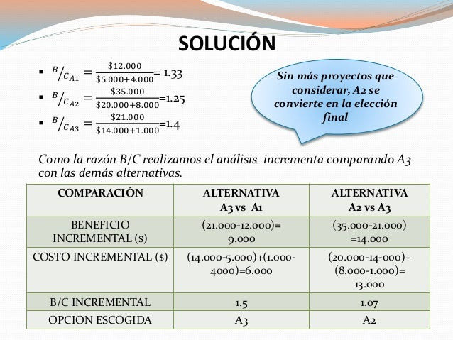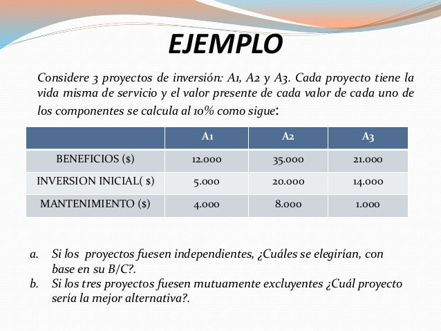 El cambiar tu sistema contable dependerá de muchos factores. Claramente la relación BC de B es mejor que la del proyecto A por lo que debe ser la seleccionada. Se halla la relación costo-beneficio CB que es igual a los ingresos totales netos divididos por los costos totales.