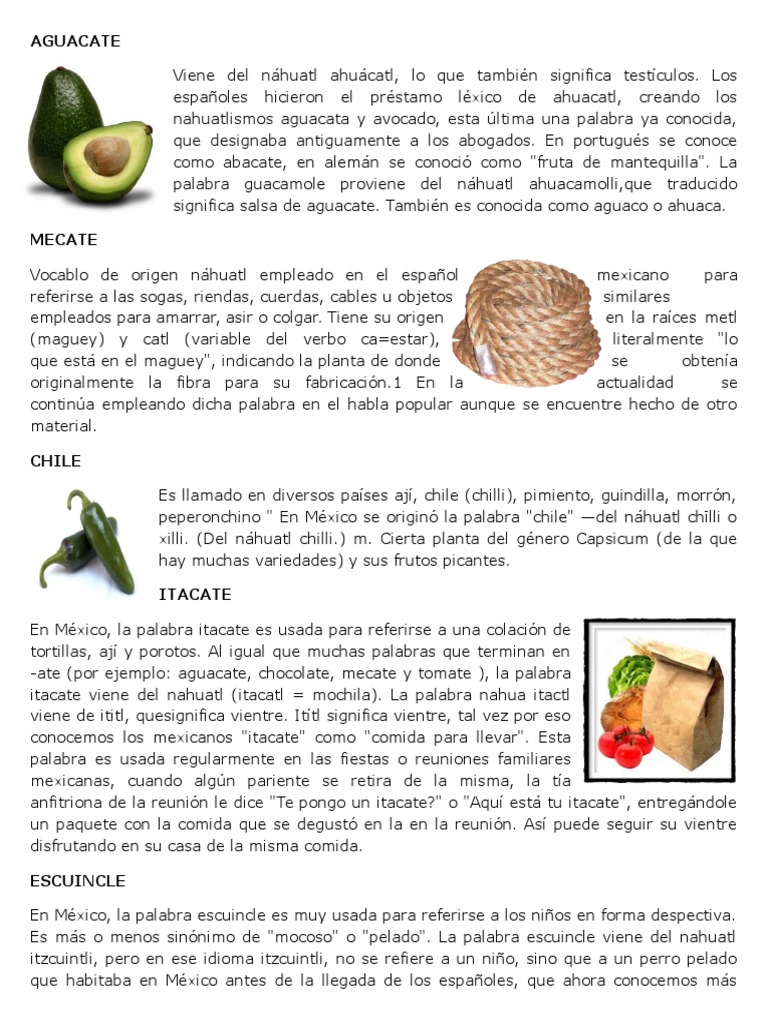 Aguacate chocolate mecate y tomate la palabra itacate viene del nhuatl itacatl mochila. Palabras De Origen Nahuatl. México es el principal productor mundial de este fruto.